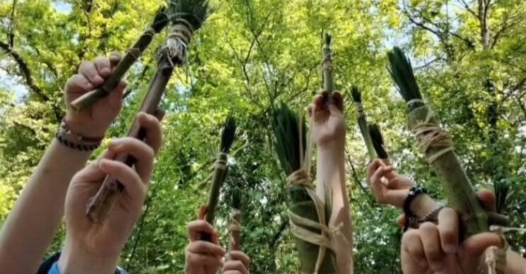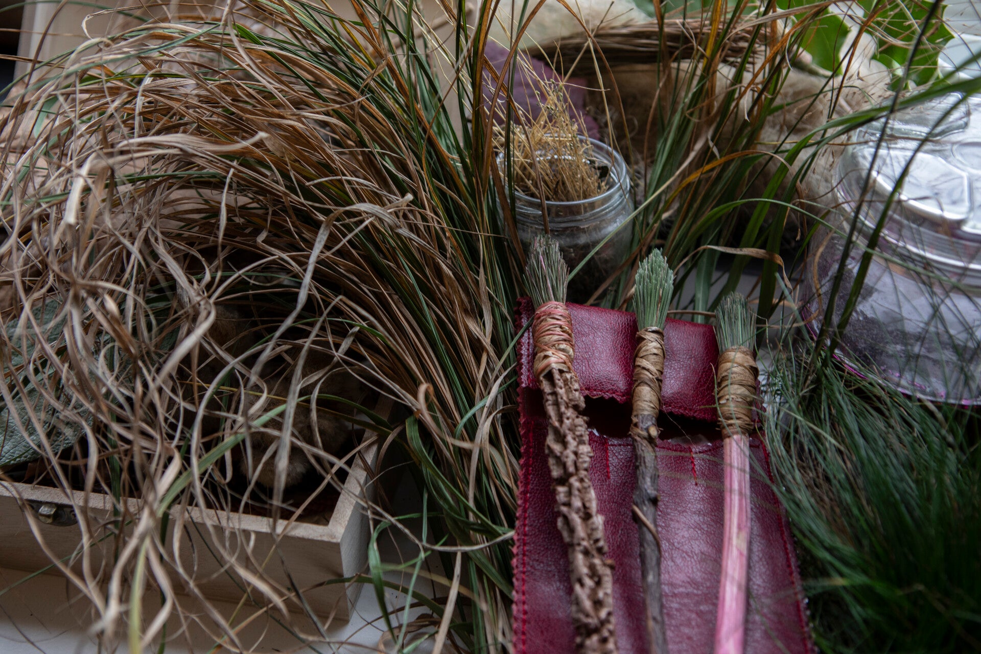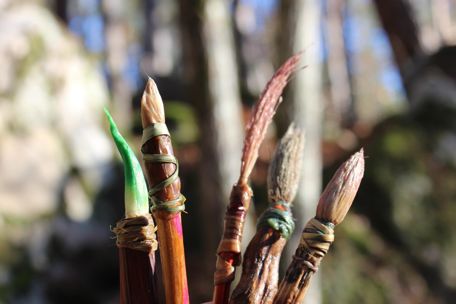 Il y a vingt ans, lors d’une animation en pleine nature, je me suis retrouvée sans pinceaux face à des enfants. Alors j’ai improvisé avec ce que j’avais sous la main : bâtons, herbe, feuilles. Mes mains ont assemblé, noué, tressé… et les premiers pinceaux végétaux sont nés.
